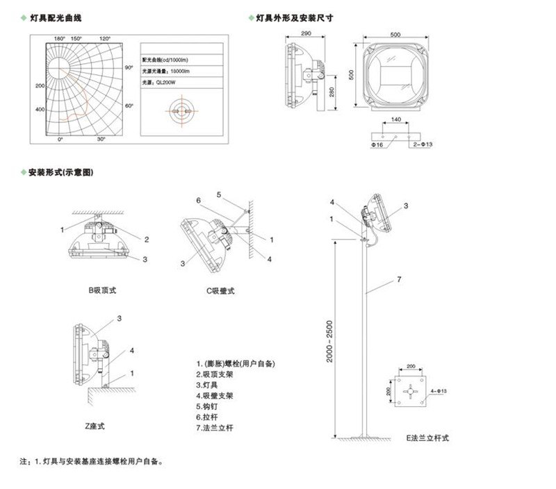 ●燈具外殼由鋁合金壓鑄成型,平面鋼化玻璃透光板,光源腔內(nèi)設(shè)有鏡面反射器。燈具外殼表面聚酯粉末噴涂。