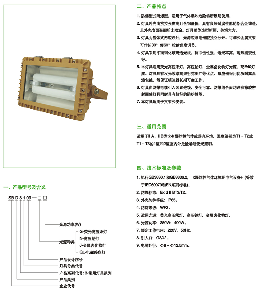 防爆泛光燈同隔爆型燈具相比,具有重量輕、價格低、安裝維護方便、使用壽命長等優(yōu)點