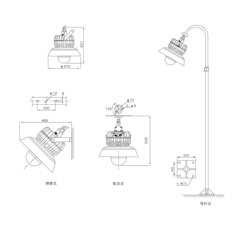 3)豎直吊桿式安裝:先將接頭穿過電纜,旋入鋼管,擰緊緊定螺釘,然后將電纜依次穿過墊片、密封圈直至接線盒內(nèi)(預(yù)留出一定長度的電纜方便接線),再將燈體與接頭擰緊,擰緊緊定螺釘;