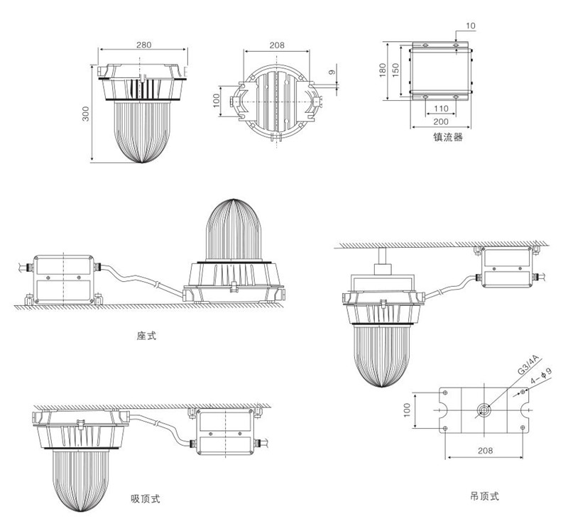 有座式、吸頂式、壁掛式和吊頂式等多種安裝方式,適應(yīng)不同工作現(xiàn)場的照明需要。