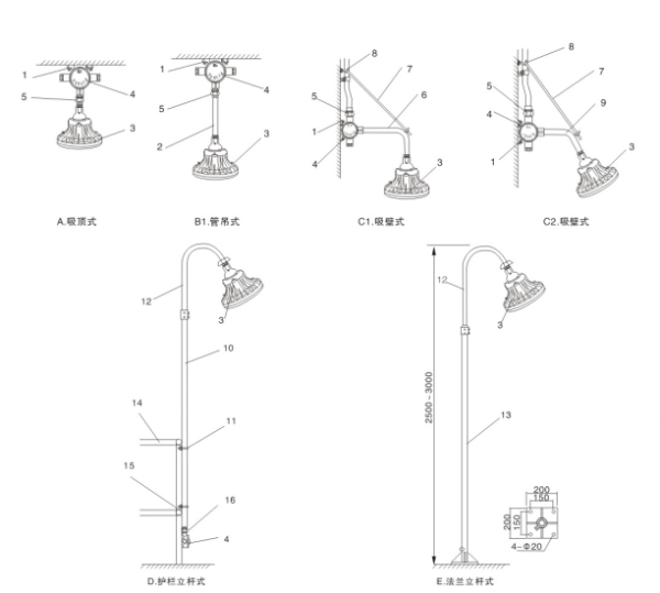 安裝方式:支架式、壁掛式、吸頂式、護(hù)欄法蘭立桿式
