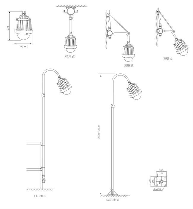 ●安裝方式可根據(jù)實際現(xiàn)場需要,選擇通過頂蓋上螺紋實現(xiàn)彎桿安裝或采用吸頂支架的方式實現(xiàn)吸頂安裝和側(cè)壁安裝。