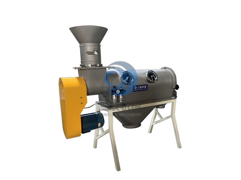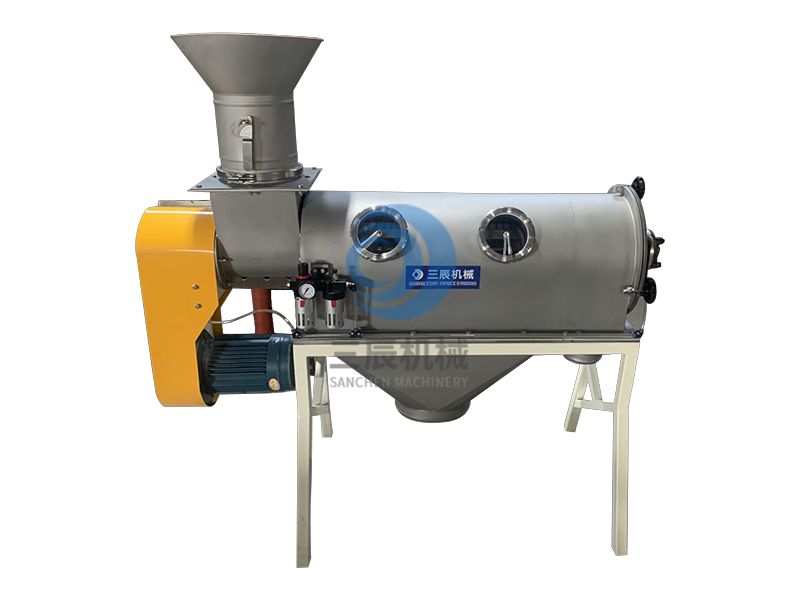 篩機(jī)由電機(jī)、機(jī)座、篩箱、進(jìn)出料推進(jìn)裝置等組成。物料由料斗經(jīng)螺旋輸送進(jìn)入篩箱,分流葉片連續(xù)轉(zhuǎn)動(dòng),形成了物料在篩箱內(nèi)不斷的更新推進(jìn),使物料產(chǎn)生運(yùn)動(dòng)沖向篩網(wǎng),細(xì)料通過篩網(wǎng)落入成品倉(cāng),粗料繼續(xù)向前推進(jìn),在粗料口排出,從而達(dá)到理想的篩分效果。